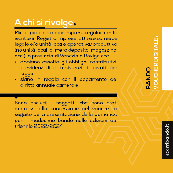 Possono beneficiare delle agevolazioni di cui al presente Bando le micro, le piccole e le medie imprese come definite dall’All. I al Reg. n. 651/2014/UE della Commissione europea, aventi sede legale e/o unità locale operativa/produttiva (no unità locali di mero deposito) nella circoscrizione territoriale della Camera di commercio di Venezia Rovigo con i requisiti di cui all’art. 4 del bando, tra cui la regolarità del diritto annuale camerale (per la verifica di tale adempimento è possibile rivolgersi all’Ufficio Diritto Annuale – E-mail: diritto.annuale@dl.camcom.it).