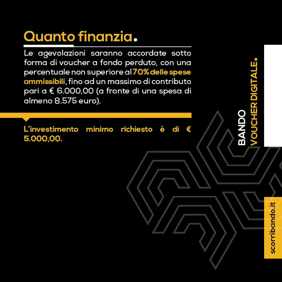 Valore del voucher: importo non superiore al 70% delle spese ammissibili, fino ad un massimo di € 6.000,00 (investimento minimo richiesto € 5.000,00);