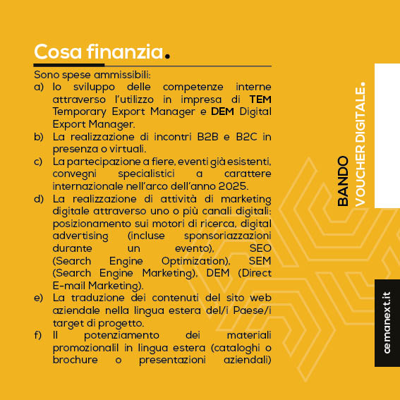 d) la realizzazione di attività di marketing digitale attraverso uno o più canali digitali: posizionamento sui motori di ricerca, digital advertising (incluse sponsorizzazioni durante un evento), SEO (Search Engine Optimization), SEM (Search Engine Marketing), D.E.M. (direct E-mail Marketing). Tutte le attività di marketing digitale dovranno obbligatoriamente essere realizzate per il tramite di una Società di consulenza;