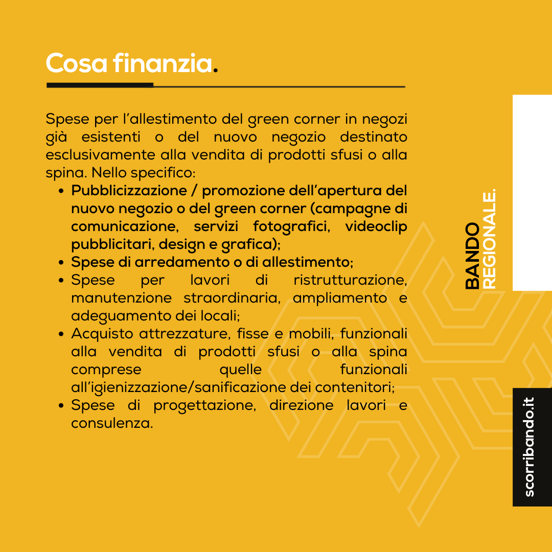 Spese per l’allestimento del green corner in negozi già esistenti o del nuovo negozio destinato esclusivamente alla vendita di prodotti sfusi o alla spina. Nello specifico: