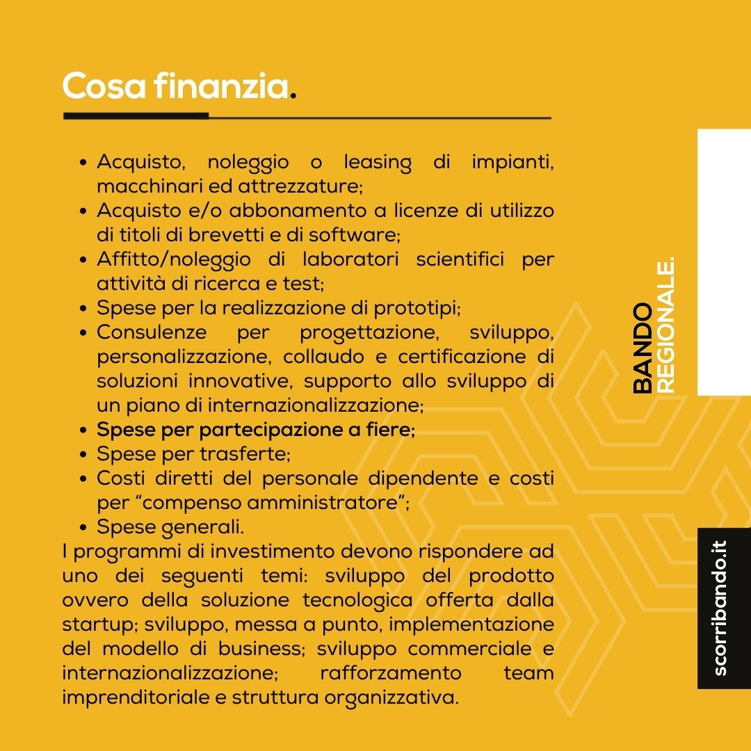 La Regione Emilia-Romagna intende supportare i programmi di investimento delle Start up innovative, che dovranno rispondere ad uno dei seguenti temi: sviluppo del prodotto ovvero della soluzione tecnologica offerta dalla startup; sviluppo, messa a punto, implementazione del modello di business; sviluppo commerciale e internazionalizzazione; rafforzamento team imprenditoriale e struttura organizzativa.