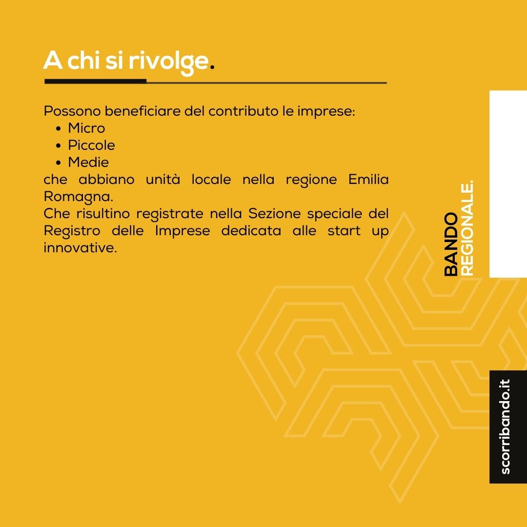 Possono beneficiare del contributo le imprese Micro, Piccole e Medie che abbiano unità locale nella regione Emilia-Romagna e che risultino registrate nella Sezione speciale del Registro delle Imprese dedicata alle start up innovative.