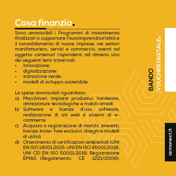 c. acquisto di software e licenze d’uso software, marchi, brevetti e licenze di produzione commisurati alle esigenze produttive e gestionali dell’impresa; rilascio delle certificazioni ISO 14001:2015, 45001:2018, 50001:2018; registrazione EMAS; ReMade in Italy; Plastica Seconda Vita; Cradle to cradle; Carbon footprint; Ecolabel; Greenguard;