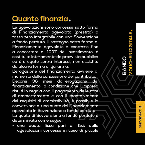3) Forma Mista. Quota di finanziamento agevolato a cui si aggiunge una Sovvenzione a Fondo Perduto, calcolata sull’investimento totale al netto delle spese tecniche.