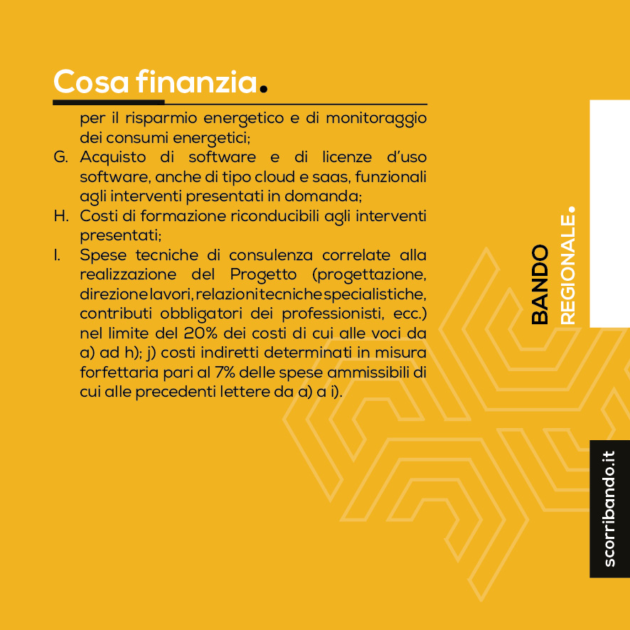 I. Spese tecniche di consulenza correlate alla realizzazione del Progetto (progettazione, direzione lavori, relazioni tecniche specialistiche, contributi obbligatori dei professionisti, ecc.) nel limite del 20% dei costi di cui alle voci da a) ad h); j) costi indiretti determinati in misura forfettaria pari al 7% delle spese ammissibili di cui alle precedenti lettere da a) a i).