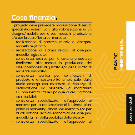 Il progetto deve prevedere l’acquisizione di servizi specialistici esterni volti alla valorizzazione di un disegno/modello per la sua messa in produzione e/o per la sua offerta sul mercato.