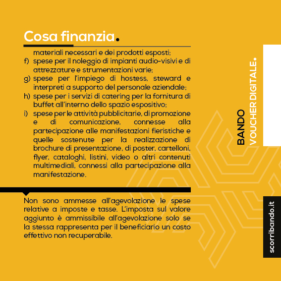 - manifestazioni fieristiche e quelle sostenute per la realizzazione di brochure di presentazione, di poster, cartelloni, flyer, cataloghi, listini, video o altri contenuti multimediali, connessi alla partecipazione alla manifestazione.