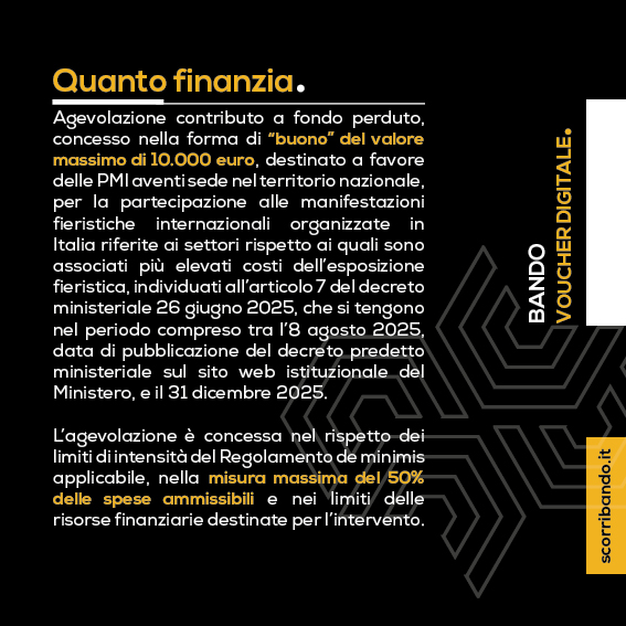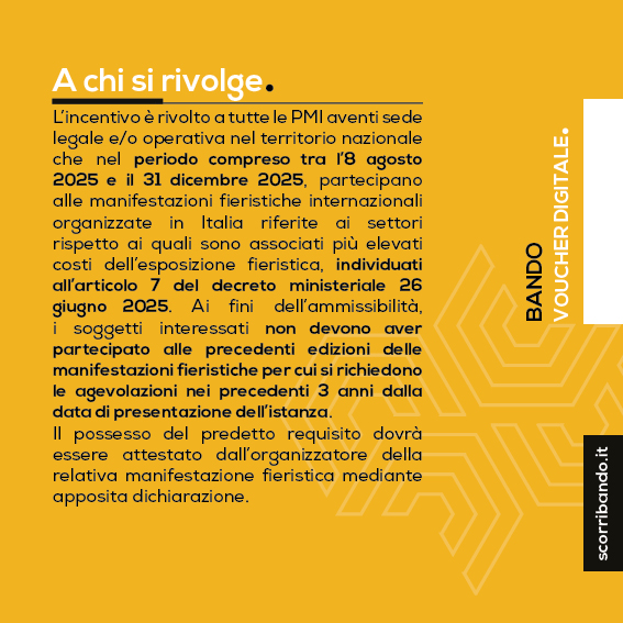 L’incentivo è rivolto a tutte le PMI aventi sede legale e/o operativa nel territorio nazionale che nel periodo compreso tra l’8 agosto 2025 e il 31 dicembre 2025, partecipano alle manifestazioni fieristiche internazionali organizzate in Italia.