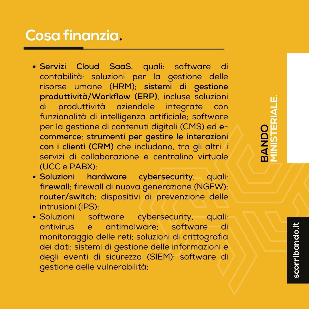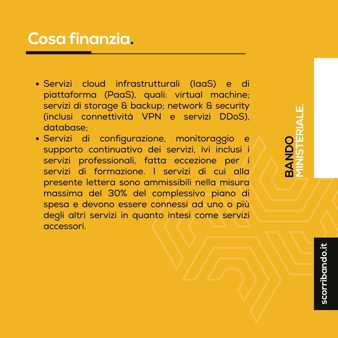 Sostenere l’acquisto di servizi e prodotti di cloud computing e cyber security a fronte dell’acquisizione di soluzioni tecnologiche nuove e aggiuntive rispetto a quelle a disposizione e/o di soluzioni tecnologiche più avanzate e sicure rispetto a quelle in uso.
