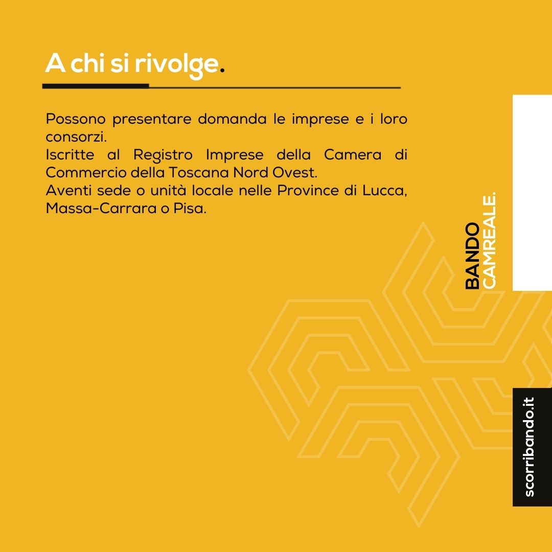 Possono presentare domanda le imprese e i loro consorzi. Iscritte al Registro Imprese della Camera di Commercio della Toscana Nord Ovest. Aventi sede o unità locale nelle Province di Lucca, Massa-Carrara o Pisa.