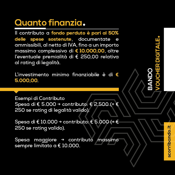 Il contributo a fondo perduto è pari al 50% delle spese sostenute, documentate e ammissibili, al netto di IVA, fino a un importo massimo complessivo di € 10.000,00, oltre l’eventuale premialità di € 250,00 relativa al rating di legalità. L’investimento minimo finanziabile è di € 5.000,00.