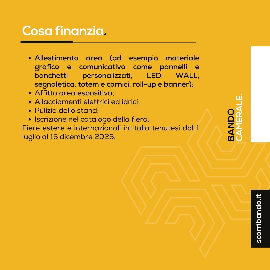 Il bando intende supportare le imprese che partecipano a fiere estere e internazionali in Italia tenutesi dal 1 luglio al 15 dicembre 2025.