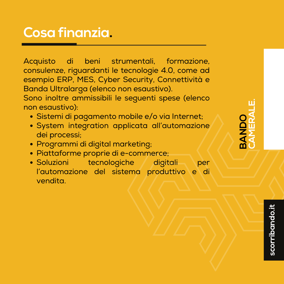 Acquisto di beni strumentali, formazione, consulenze, riguardanti le tecnologie 4.0, come ad esempio ERP, MES, Cyber Security, Connettività e Banda Ultralarga (elenco non esaustivo).