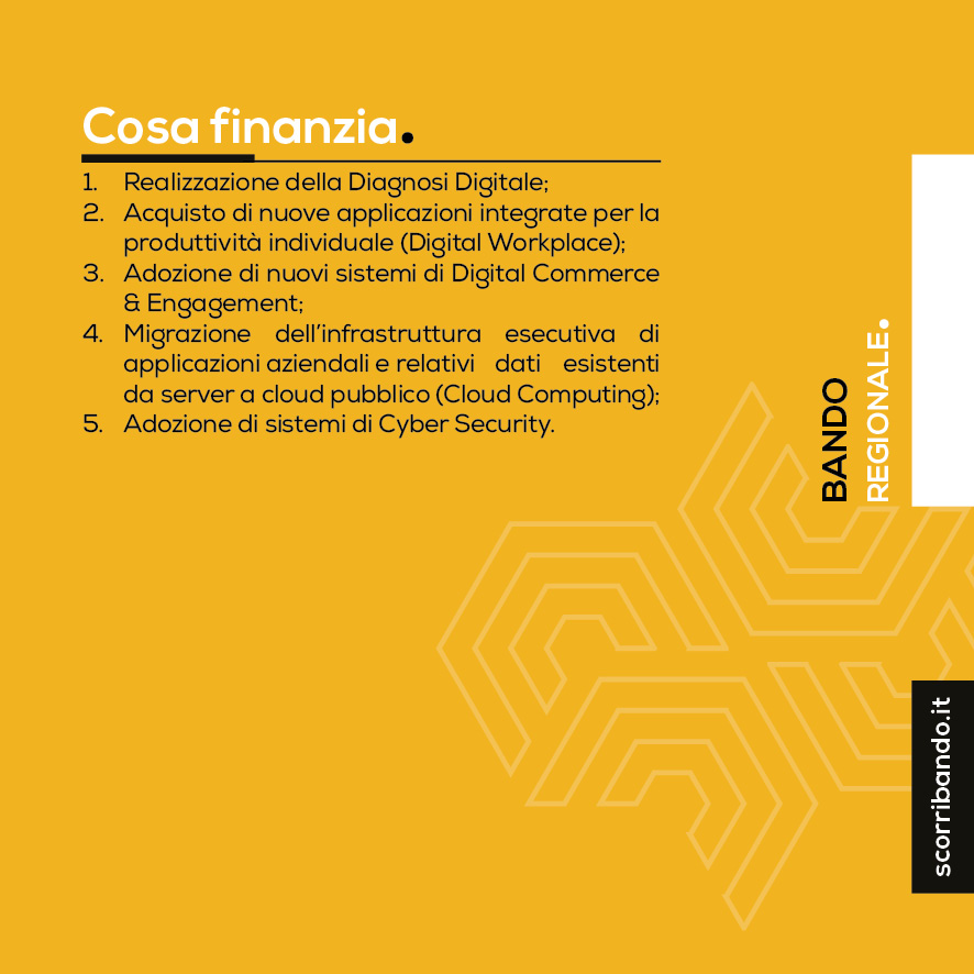 Obiettivo della misura è sostenere i progetti volti ad adottare alcune soluzioni digitali diffuse e trasversali, idonee ad aumentarne l’efficienza e la competitività.