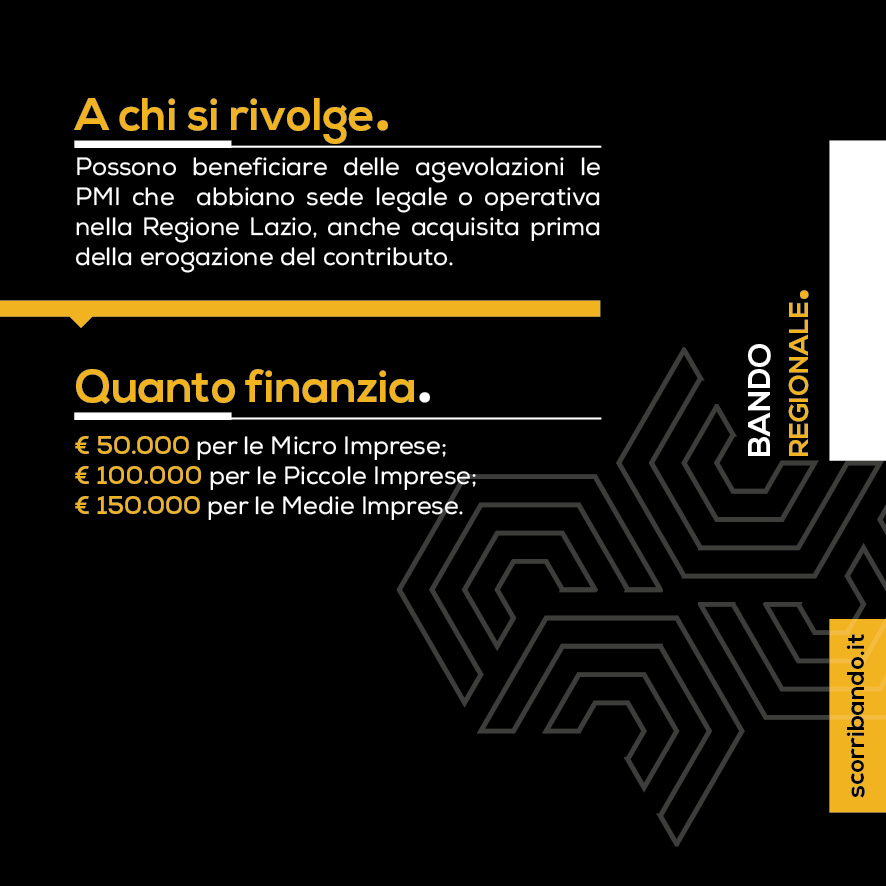 Possono beneficiare delle agevolazioni le PMI che abbiano sede legale o operativa nella Regione Lazio, anche acquisita prima della erogazione del contributo.